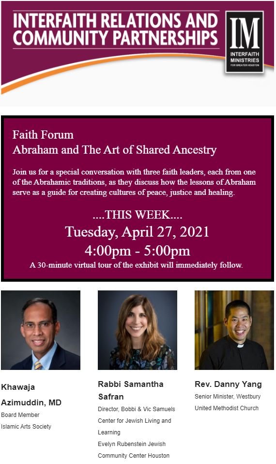 The Islamic Arts Society participated in a panel discussion with leaders of Abrahamic faiths in a zoom meeting organized by the Interfaith ministry of Greater Houston.
