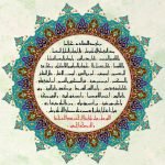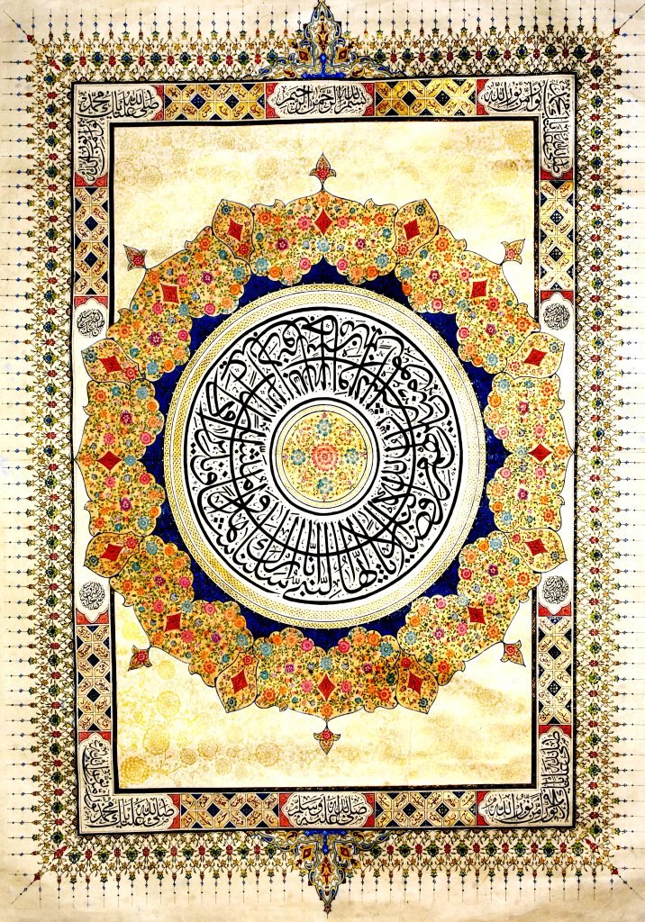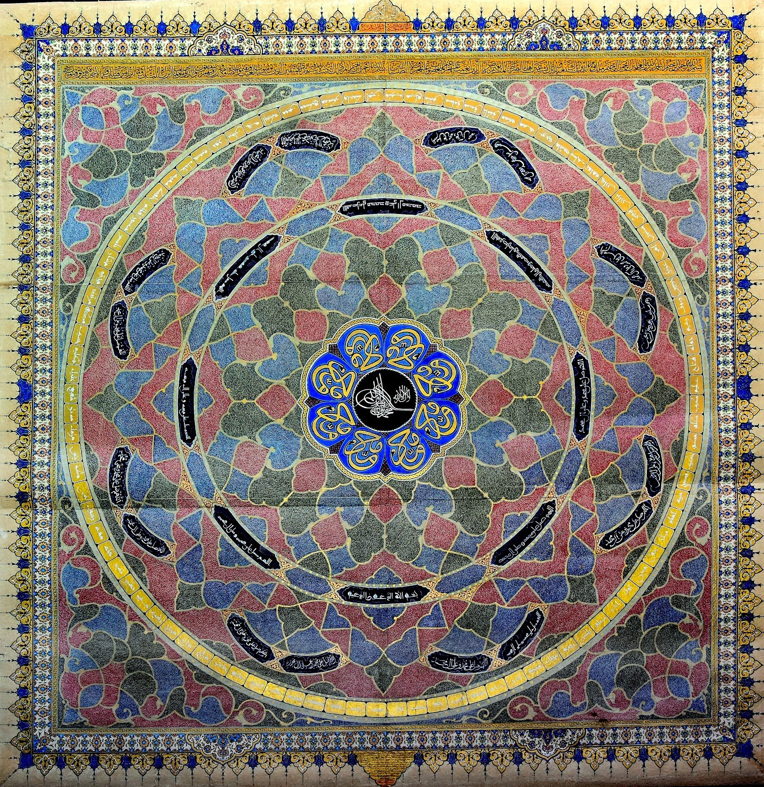 Description: Quranic verses in the middle circle praising the Prophet “Indeed We have sent you as a witness and a bearer of good tidings for the believers and a warner, a caller to God by His permission and an illuminating lamp.”
