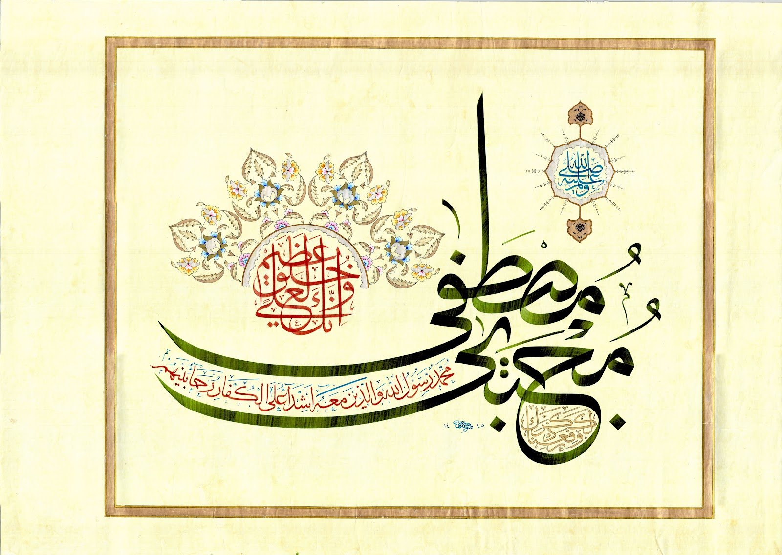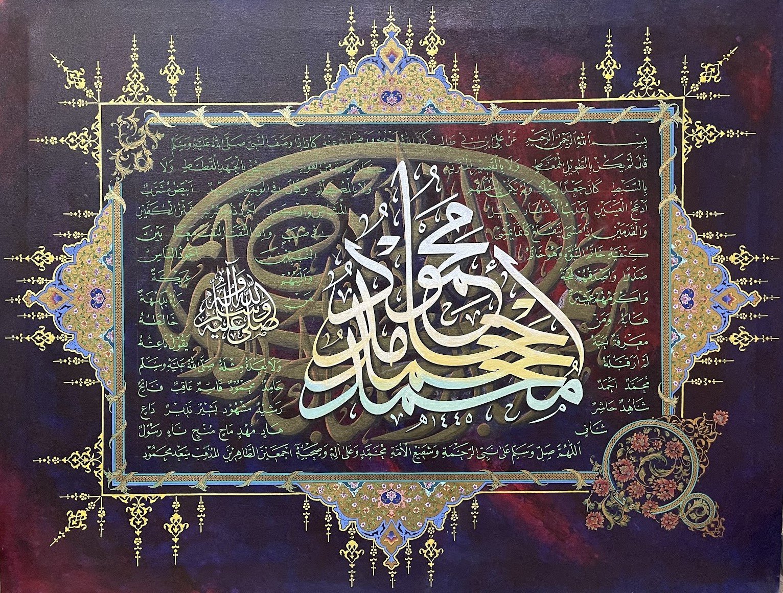 Description: A bright and illuminating piece like the luminous character of the Prophet PBUH. This piece brings a soothing, refreshing feeling to the heart. The Hilye in Tuluth script is surrounded by the names of the four Caliphs and there is heavy illumination all around.