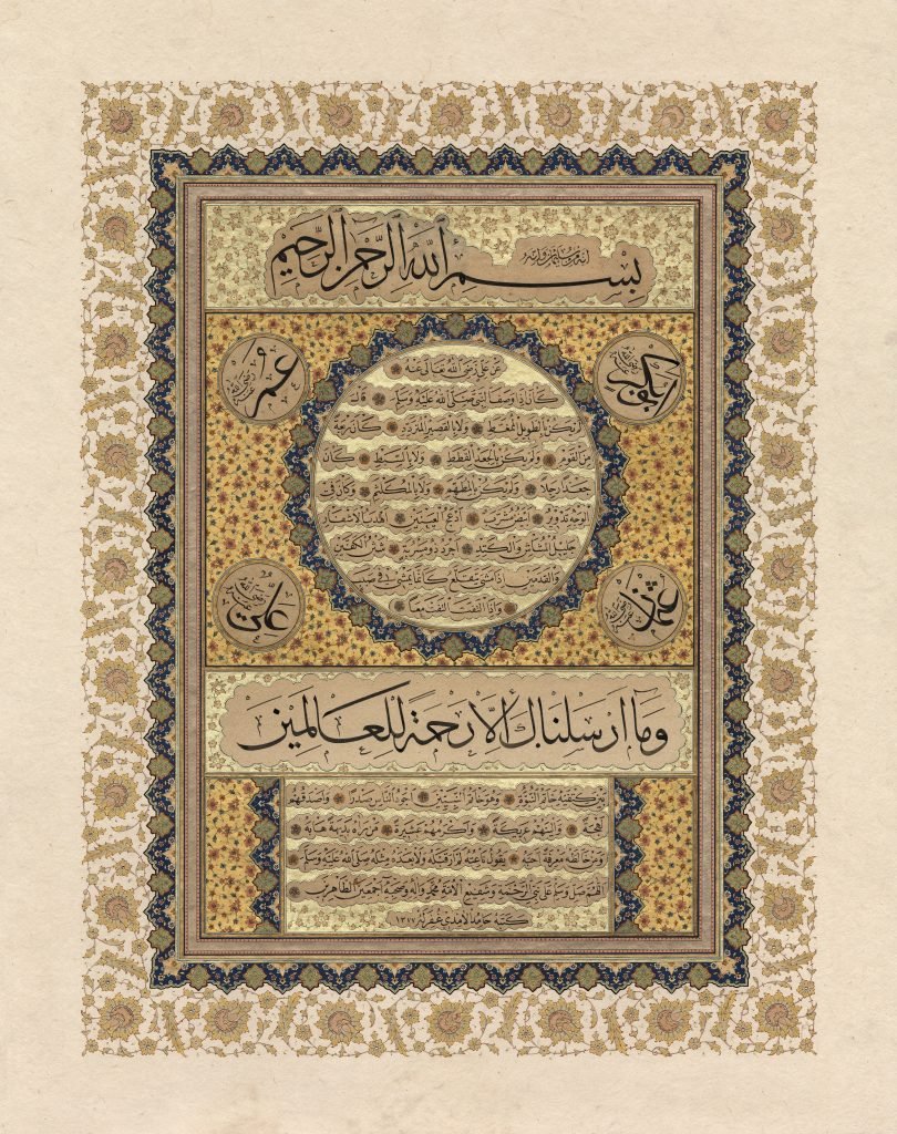 A Hilya is a portrayal of the Prophet using Qur’anic verses and Hadith describing the Prophet Muhammad. These include a description of not only his blessed appearance, but also his beautiful character and merciful nature.