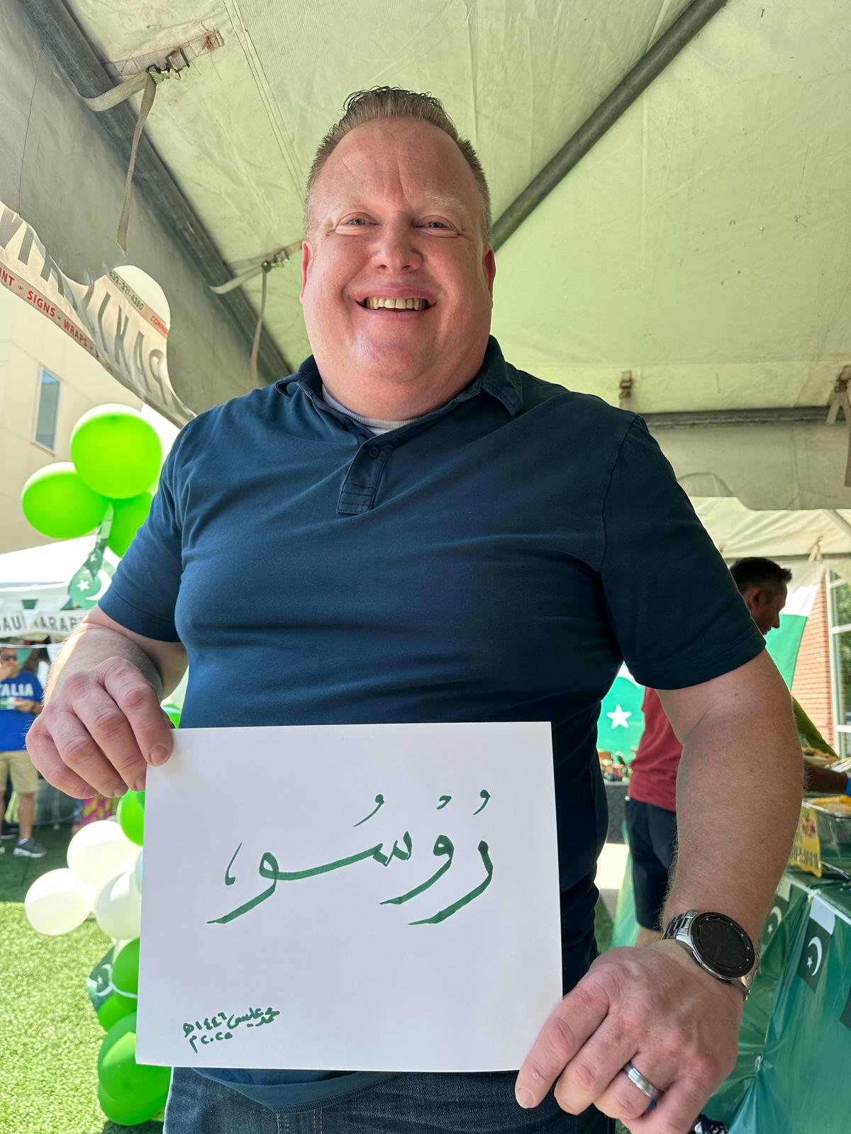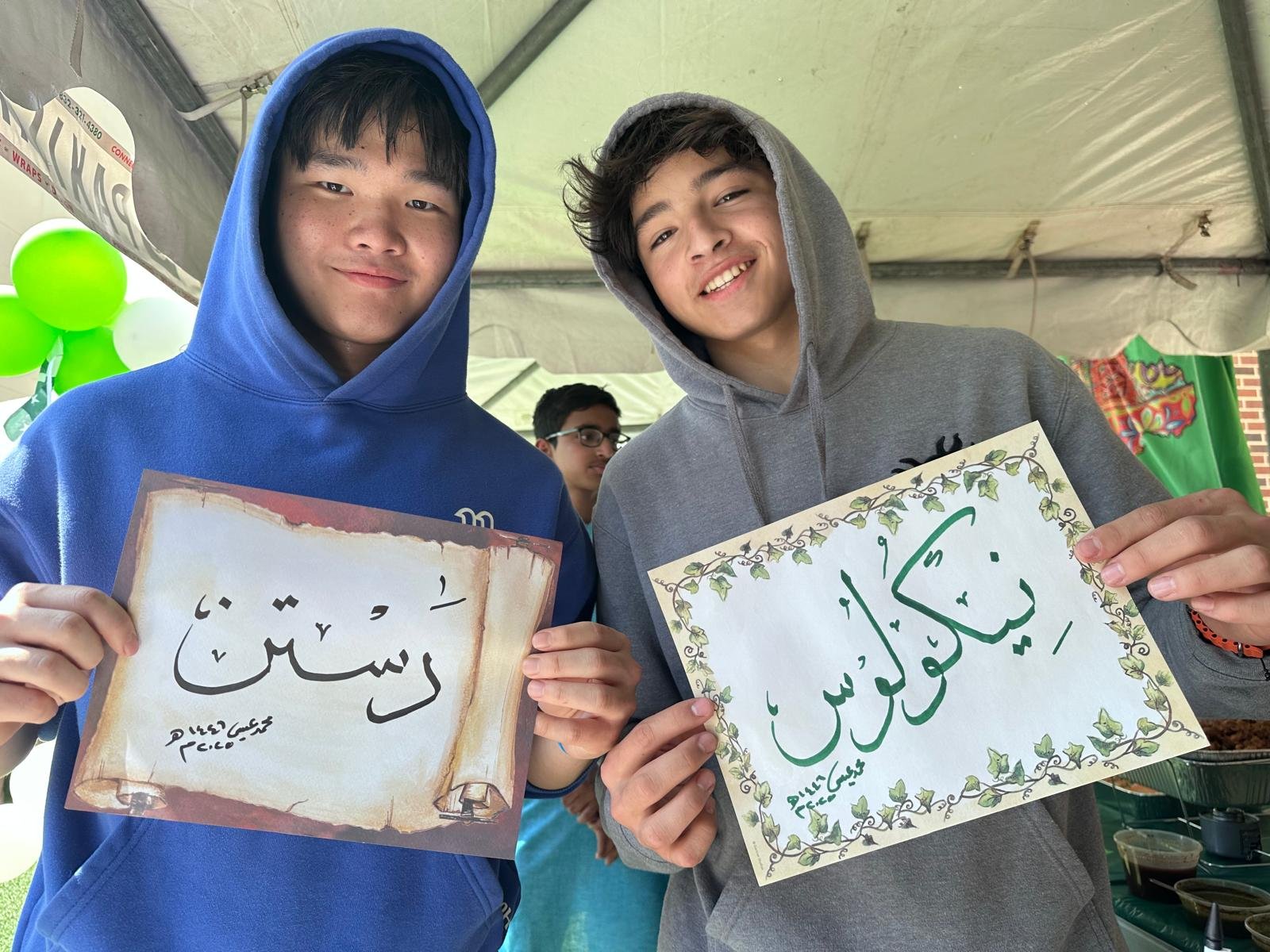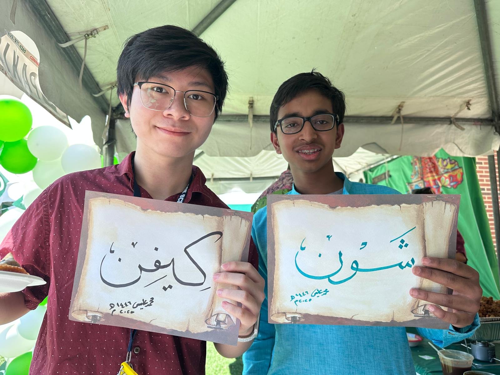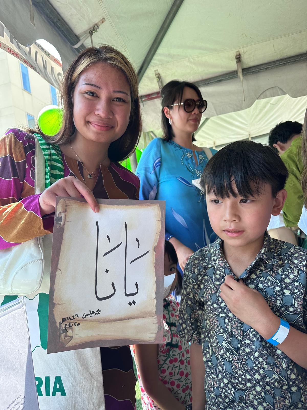 Once again, our artists displayed the art of calligraphy at the village school during the international festival this year. The Islamic calligraphy booth is always the most popular attraction for adults and children at the village school International festival.
