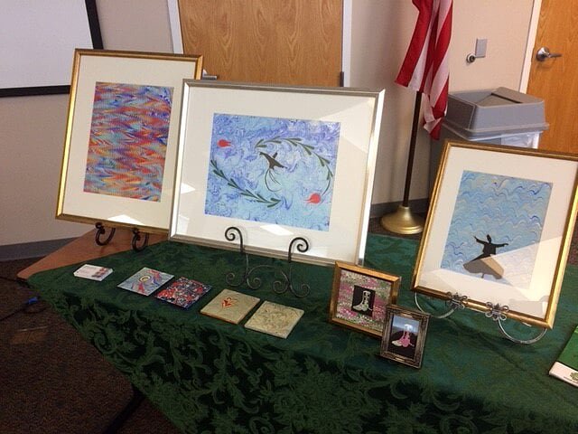 During March 2019 Islamic Arts Society put up a display of Islamic Arts at the R B Tullis branch of Montgomery Public Library. The art was displayed in the library cabinets for the whole month. Artist Shaheen Rahman also conducted an Ebru workshop as part of the display which was well received by library goes in Montgomery County.