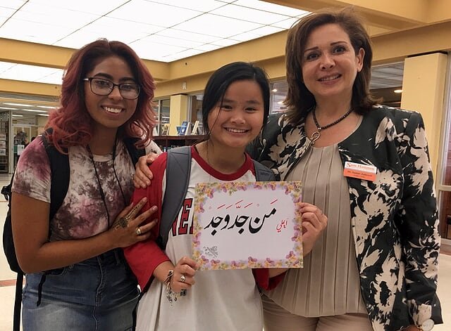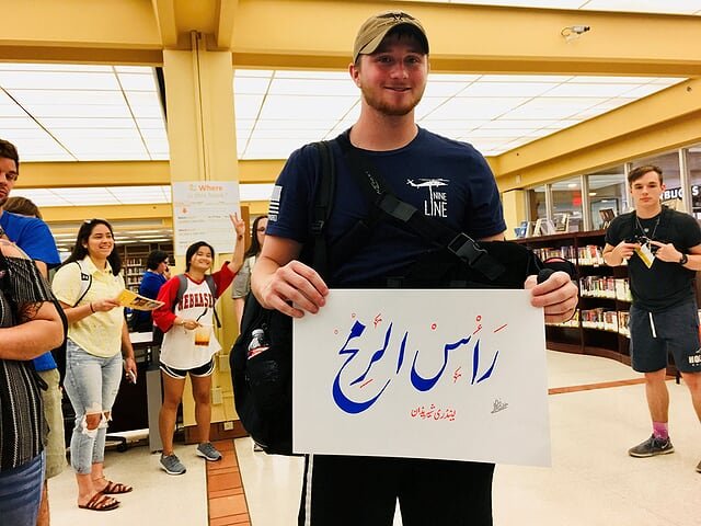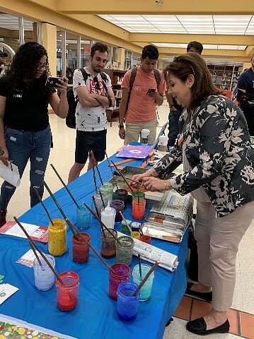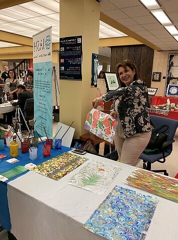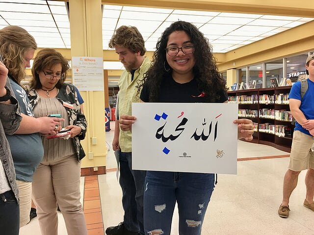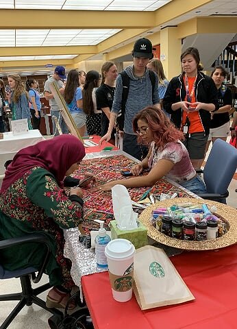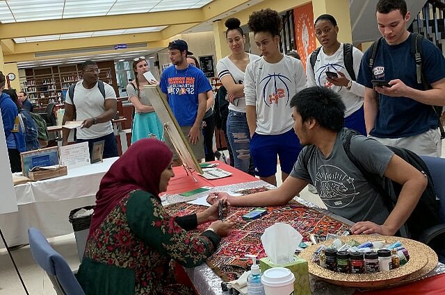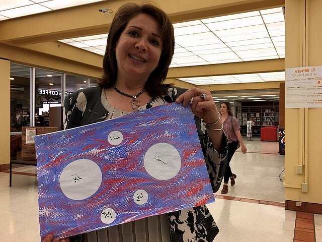 On the 10th of April 2019 Three artists from the Islamic Arts Society in the Islam Awareness week at The Sam Houston, State University in Huntsville, TX. The event was held at the Newton Gresham Library. Artist Zulfiqar Ali intrigued visitors with beautiful Arabic Calligraphy while artist Zohra Siddiqui drew exquisite henna patterns on hands. Artist Shaheen Rahman mesmerized with Ebru water marbling on paper. The event was heavily attended by students and faculty of Sam Houston State University and for many of them it was their first positive exposure to Islam.